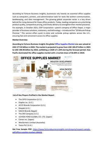 According to Fortune Business Insights the global Office Supplies Market size was valued at USD 177.53 billion in 2024. The market is projected to grow from USD 183.07 billion in 2025 to USD 198.98 billion by 2032, exhibiting a CAGR of 1.64% during the forecast period. Asia Pacific dominated the office supplies market with a market share of 50.09% in 2024.