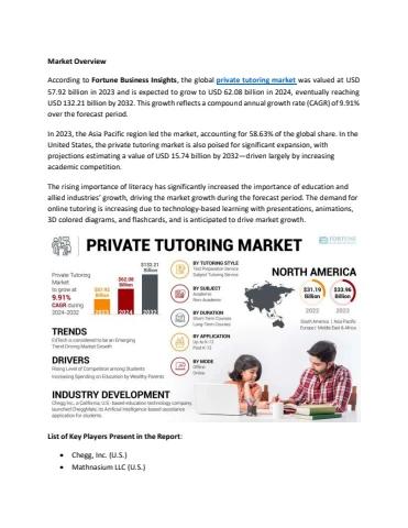 According to Fortune Business Insights, the global private tutoring market was valued at USD 57.92 billion in 2023 and is expected to grow to USD 62.08 billion in 2024, eventually reaching USD 132.21 billion by 2032. This growth reflects a compound annual growth rate (CAGR) of 9.91% over the forecast period.