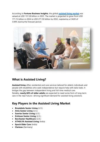 According to Fortune Business Insights, the global assisted living market was valued at USD 157.28 billion in 2023. The market is projected to grow from USD 171.15 billion in 2024 to USD 271.50 billion by 2032, registering a CAGR of 5.94% during the forecast period.
