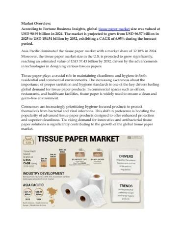 According to Fortune Business Insights, global tissue paper market size was valued at USD 90.99 billion in 2024. The market is projected to grow from USD 96.57 billion in 2025 to USD 154.54 billion by 2032, exhibiting a CAGR of 6.95% during the forecast period.