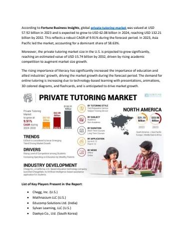 According to Fortune Business Insights, global private tutoring market was valued at USD 57.92 billion in 2023 and is expected to grow to USD 62.08 billion in 2024, reaching USD 132.21 billion by 2032. This reflects a robust CAGR of 9.91% during the forecast period. In 2023, Asia Pacific led the market, accounting for a dominant share of 58.63%.