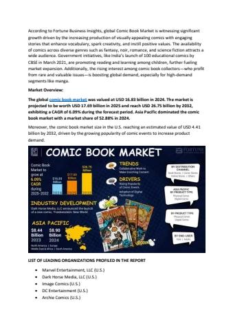 The global comic book market was valued at USD 16.83 billion in 2024. The market is projected to be worth USD 17.69 billion in 2025 and reach USD 26.75 billion by 2032, exhibiting a CAGR of 6.09% during the forecast period. Asia Pacific dominated the comic book market with a market share of 52.88% in 2024.