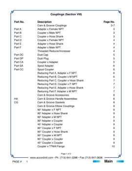 Couplings (Section VIII) Part No. Description Page No. Page 1 of 2 Cam & Groove Couplings 3-7 Part A Adapter x Female NPT 3 Part B Coupler x Male NPT 3