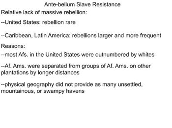 Ante-bellum Slave Resistance Relative lack of massive rebellion:--United States: rebellion rare--Caribbean, Latin America: rebellions larger and more frequent