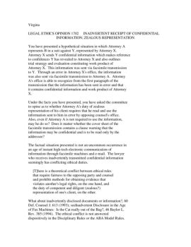 Virgina LEGAL ETHICS OPINION 1702 INADVERTENT RECEIPT OF CONFIDENTIAL INFORMATION; ZEALOUS REPRESENTATION You have presented a hypothetical situation in which ...