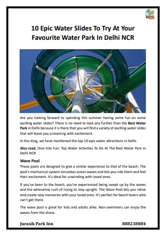 The Water Park in Delhi offers a wide range of thrilling water slides and attractions suitable for all ages. From the Wave Pool, Kids Pool, and Family Pool to the high-speed body slide, Launcher for Thunder, and Tunnel Turning Slide, there’s something for everyone looking to beat the heat and have a fun-filled day. Read more: https://jurasikparkinn.com/10-epic-water-slides-at-your-favourite-water-park-in-delhi-ncr/