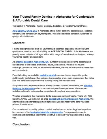 ACE DENTAL CARE LLC in Alpharetta offers family dentistry, pediatric care, sedation dentistry, and dentists with payment plans. Visit the best-rated dentist in Alpharetta for quality, affordable care.
