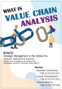 "What is Value Chain Analysis" ฉบับนี้ จัดทำขึ้นเพื่อเป็นส่วนหนึ่งของการเรียนการสอนในรายวิชา BUS632การจัดการเชิงกลยุทธ์ในยุคโลกาภิวัตน์ (Strategic Management in the Globalization era) บัณฑิตวิทยาลัยการจัดการและนวัตกรรม มหาวิทยาลัยเทคโนโลยีพระจอมเกล้าธนบุรี (มจธ.) โดยมีจุดประสงค์เพื่อศึกษาเรื่องการใช้เครื่องมือการจัดการเชิงกลยุทธ์ ในส่วนของ Value Chain หรือ ทฤษฎีห่วงโซ่แห่งคุณค่า และถ่ายทอดความรู้ที่ได้จากการศึกษาในเรื่องของความเป็นมา ความหมาย และการนำไปใช้ เพื่อทำการวิเคราะห์ปัจจัยภายในขององค์กร หน่วยงานหรือบริษัท