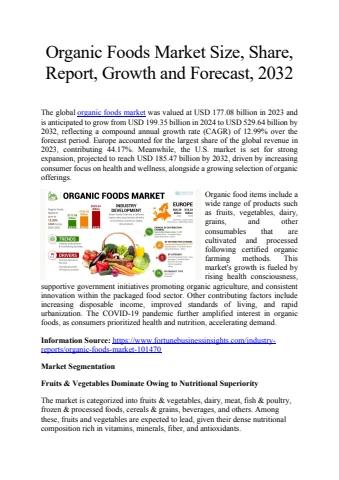 The global organic foods market was valued at USD 177.08 billion in 2023 and is anticipated to grow from USD 199.35 billion in 2024 to USD 529.64 billion by 2032, reflecting a compound annual growth rate (CAGR) of 12.99% over the forecast period.