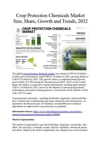 The global crop protection chemicals market was valued at USD 64.18 billion in 2024 and is forecasted to reach USD 67.18 billion in 2025, growing further to USD 97.01 billion by 2032. This growth reflects a compound annual growth rate (CAGR) of 5.39% during the forecast period (2025–2032).