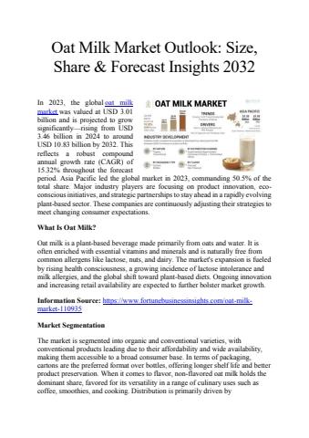In 2023, the global oat milk market was valued at USD 3.01 billion and is projected to grow significantly—rising from USD 3.46 billion in 2024 to around USD 10.83 billion by 2032. This reflects a robust compound annual growth rate (CAGR) of 15.32% throughout the forecast period.