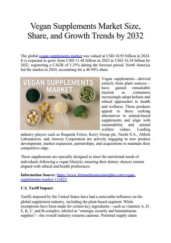 The global vegan supplements market was valued at USD 10.93 billion in 2024. It is expected to grow from USD 11.48 billion in 2025 to USD 16.54 billion by 2032, registering a CAGR of 5.35% during the forecast period. North America led the market in 2024, accounting for a 46.94% share.