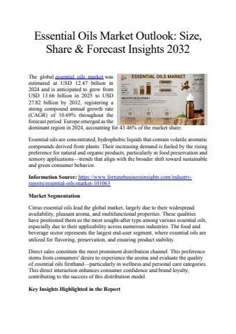 The global essential oils market was estimated at USD 12.47 billion in 2024 and is anticipated to grow from USD 13.66 billion in 2025 to USD 27.82 billion by 2032, registering a strong compound annual growth rate (CAGR) of 10.69% throughout the forecast period.