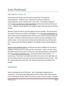 Perfected Love Page 1 Love Perfected Text: I John 2:3 – 6; 4:11 – 21 And by this we know that we have come to know him, if we keep his commandments.
