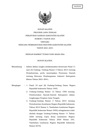 Perda 3 2021 tentang Rencana Pembangunan Industri Kabupaten Klaten