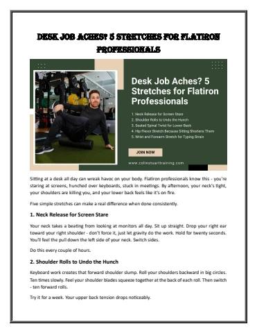 Sitting at a desk all day can wreak havoc on your body. Flatiron professionals know this - you're staring at screens, hunched over keyboards, stuck in meetings. By afternoon, your neck's tight, your shoulders are killing you, and your lower back feels like it's on fire.
