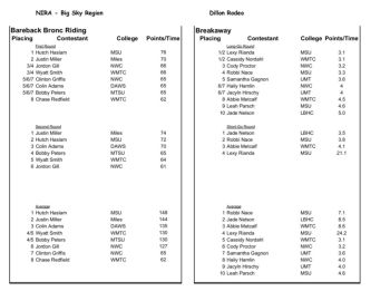 NIRA - Big Sky Region Dillon Rodeo Bareback Bronc Riding Breakaway Placing Contestant College Points/Time Placing Contestant CollegePoints/Time