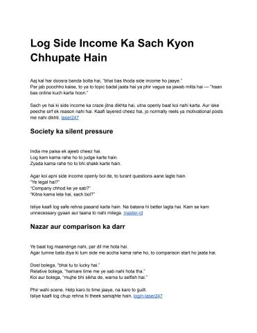 Aaj kal har doosra banda bolta hai, “bhai bas thoda side income ho jaaye.” Par jab poochho kaise, to ya to topic badal jaata hai ya phir vague sa jawab milta hai — “haan bas online kuch karta hoon.” Sach ye hai ki side income ka craze jitna dikhta hai, utna openly baat koi nahi karta. Aur iske peeche sirf ek reason nahi hai. Kaafi layered cheez hai, jo normally reels ya motivational posts me nahi dikhti. laser247
