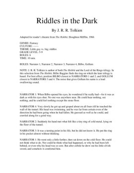 Riddles in the Dark By J. R. R. Tolkien Adapted for reader’s theatre from The Hobbit, Houghton Mifflin, 1966 GENRE: Fantasy CULTURE: —— THEME: Little guy vs ...