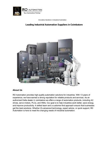 RD Automation has been providing trusted industrial automation solutions since 2012. As an authorized Delta Electronics dealer in Coimbatore, we offer high-quality AC drives, PLCs, HMIs, servo motors, SCADA, sensors, and more. With 13 years of expertise, we ensure reliable products, excellent service, and customer satisfaction. Our commitment to innovation makes us a preferred automation partner.
