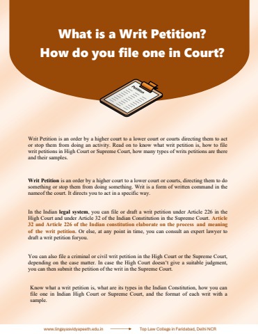Writ Petition is an order by a higher court to a lower court or courts directing them to act or stop them from doing an activity. Read on to know what writ petition is, how to file writ petitions in High Court or Supreme Court, how many types of writs petitions are there and their samples.