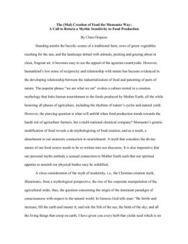 The (Mal) Creation of Food the Monsanto Way: A Call to Return a Mythic Sensitivity to Food Production By Clara Oropeza Standing amidst the bucolic scenes of a ...