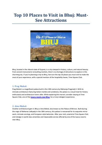 Bhuj, located in the vibrant state of Gujarat, is a city steeped in history, culture, and natural beauty. From ancient monuments to bustling markets, there's no shortage of attractions to explore in this charming city. If you're planning a trip to Bhuj, here are the top 10 places you must visit to make the most of your experience, with a special mention of the hospitality haven, Time Square Club.