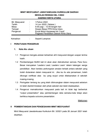 MINIT MESYUARAT JAWATANKUASA KURIKULUM DAERAH SEKOLAH RENDAH BIL.1/2022 DAERAH KINTA UTARA