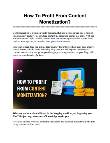 Learn how to monetize your lead generation content effectively and generate profits with our comprehensive guide. Discover the best strategies and tools to maximize your revenue today. As a leading content creation agency, we take a holistic approach to content creation and monetization. For expert advice, reach us at PiXLPlayer.com