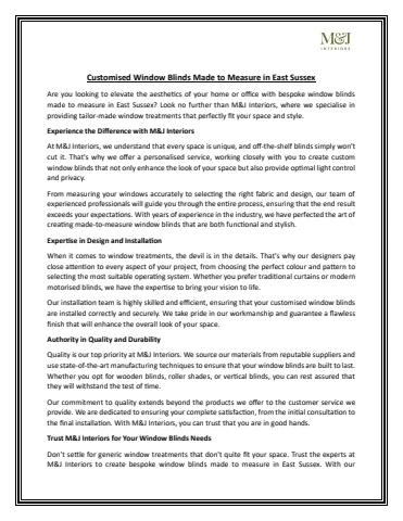 M&J Interiors specialises in made to measure window blinds in East Sussex, offering bespoke solutions to suit every style and space. Our expert team provides a full service—from professional measuring to precision installation—ensuring your window blinds fit perfectly and enhance your home or office. Choose from a wide selection of high-quality fabrics, colours, and styles including roller, Venetian, Roman, and blackout blinds. As a trusted provider of made to measure window blinds in East Sussex, M&J Interiors is committed to delivering outstanding craftsmanship and personalised customer service.