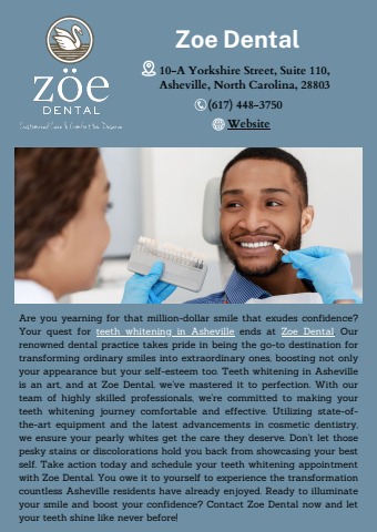 Are you yearning for that million-dollar smile that exudes confidence? Your quest for teeth whitening in Asheville ends at Zoe Dental. Our renowned dental practice takes pride in being the go-to destination for transforming ordinary smiles into extraordinary ones, boosting not only your appearance but your self-esteem too. Teeth whitening in Asheville is an art, and at Zoe Dental, we've mastered it to perfection. With our team of highly skilled professionals, we're committed to making your teeth whitening journey comfortable and effective. Utilizing state-of-the-art equipment and the latest advancements in cosmetic dentistry, we ensure your pearly whites get the care they deserve. Don't let those pesky stains or discolorations hold you back from showcasing your best self. Take action today and schedule your teeth whitening appointment with Zoe Dental. You owe it to yourself to experience the transformation countless Asheville residents have already enjoyed. Ready to illuminate your smile and boost your confidence? Contact Zoe Dental now and let your teeth shine like never before!