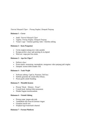 Tutorial MDi era digital yang serba cepat, perhatian audiens semakin terbatas. Video panjang sering kali terlewat, sementara potongan singkat justru menjadi pintu masuk menuju viralitas. Buku ini hadir sebagai panduan praktis bagi siapa pun yang ingin menjadi seorang cliper—profesi kreatif yang bertugas memotong, merangkum, dan mengemas video panjang menjadi klip singkat yang berdampak.