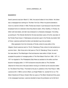 DAVID LAWRENCE, JR. BIOGRAPHY David Lawrence was born March 5, 1942, the second oldest of nine children. His father was a newspaperman working for The New York Sun.