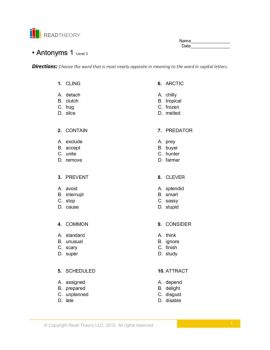 Date_____ • nAAnttoonnyymmss 11 Level 3 Diirreeccttiioonnss:: Choose the word that is most nearly opposite in meaning to the word in capital letters. 1. CLING