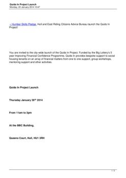 Quids In Project Launch Monday, 20 January 2014 10:47 Please pop in anytime during the launch event. Your organisation can meet with Quids In Project partners to ...