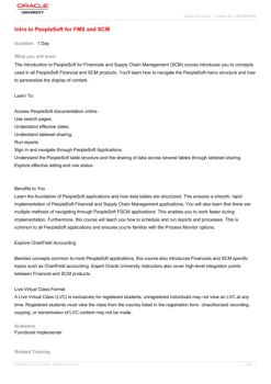 Oracle University | Contact Us: 1.800.529.0165 Intro to PeopleSoft for FMS and SCM Duration: 1 Day What you will learn The Introduction to PeopleSoft for Financials ...