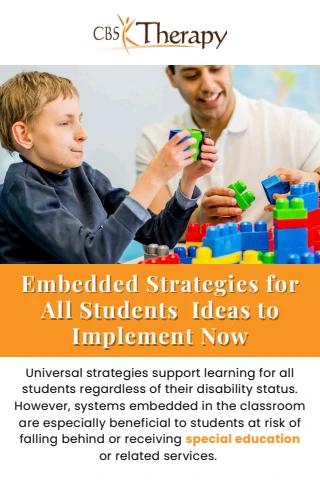 Universal strategies support learning for all students regardless of their disability status. However, systems embedded in the classroom are especially beneficial to students at risk of falling behind or receiving special education or related services. Providing best practices to all of your students is a win-win for general and special education staff and, of course, students.
