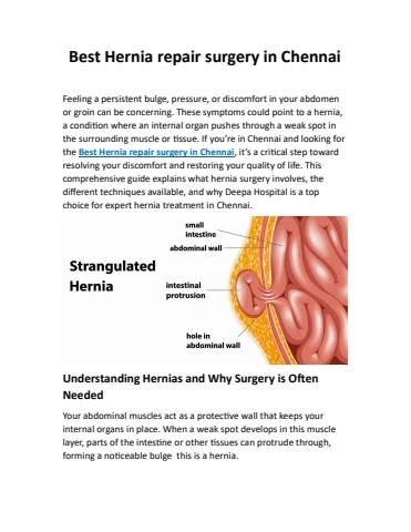 Best Hernia repair surgery in Chennai is a top search for those seeking reliable and advanced treatment options. Patients often look for hospitals that offer expert care, modern facilities, and proven success rates. One such trusted name in the city is Deep Hospital, known for its excellence in surgical care and patient satisfaction. Whether it’s an open, laparoscopic, or minimally invasive approach, their skilled surgeons ensure faster recovery and minimal discomfort. Chennai continues to grow as a hub for medical excellence, and choosing the right hospital plays a key role in successful treatment. Trust the experts for lasting relief and care. Read Also : https://deepahospital.in/blogs/kidney-stones-treatment-in-chennai/