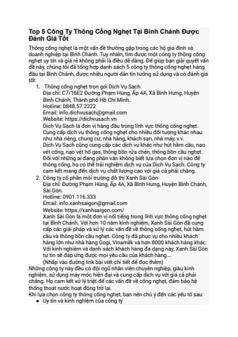 Bài viết trong đường link sau đây là danh sách 5 công ty thông cống nghẹt hàng đầu tại Bình Chánh, được nhiều người dân tin tưởng và có đánh giá tốt về chất lượng dịch vụ và giá cả.