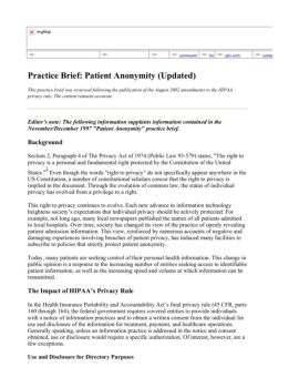 imgMap communit ho adv srch conta Practice Brief: Patient Anonymity (Updated) This practice brief was reviewed following the publication of the August 2002 amendments ...