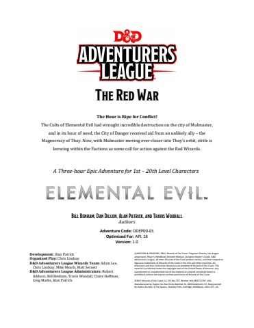 The hour is ripe for conflict! The Cults of Elemental Evil had wrought incredible destruction on the city of Mulmaster, and in its hour of need, the City of Danger received aid from an unlikely ally - the Mageocracy of Thay. Now, with Mulmaster moving ever closer into Thay's orbit, strife is brewing within the Factions as some call for action against the Red Wizards. A three-hour epic adventure for 1st-20th level characters