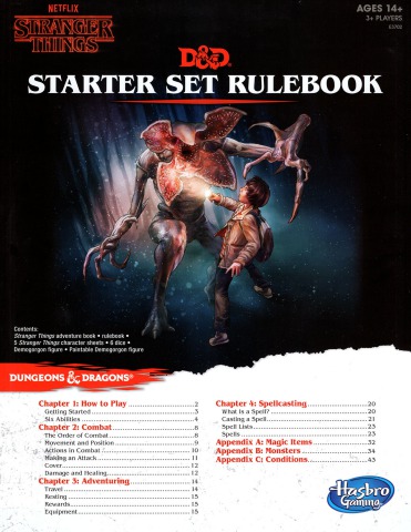 D&D Stranger Things starter set. <br>Rulebook (44p) + Adventure (28p) + Premade Character Sheets (5 chars + Demogorgon)