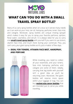 A spray bottle can be used for many purposes in everyday activities. You can use it for cleaning up the mess and a small travel spray bottle is excellent for storing sanitizer. You can visit “MoYo Natural Labs” to buy top-notch spray bottles at affordable rates.