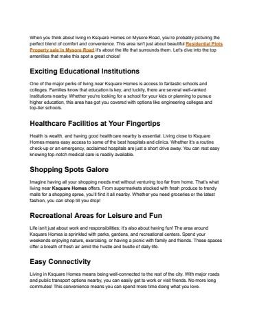 When you think about living in Ksquare Homes on Mysore Road, you’re probably picturing the perfect blend of comfort and convenience. This area isn't just about beautiful Residential Plots Property sale in Mysore Road it’s about the life that surrounds them. Let’s dive into the top amenities that make this spot a great choice!