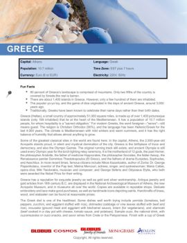 Copyright, All rights reserved. GREECE Capital: Athens Language: Greek Population: 10.7 million Time Zone: EST plus 7 hours Currency: Euro (€ or EUR) Electricity ...