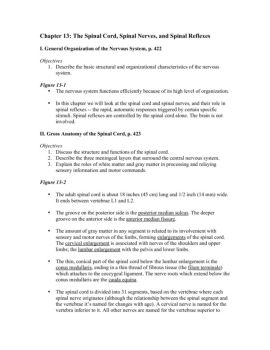 Chapter 13: The Spinal Cord, Spinal Nerves, and Spinal Reflexes I. General Organization of the Nervous System, p. 422 Objectives 1. Describe the basic structural and ...