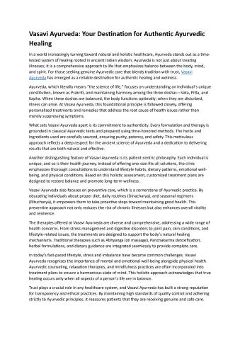 In a world increasingly turning toward natural and holistic healthcare, Ayurveda stands out as a time-tested system of healing rooted in ancient Indian wisdom. Ayurveda is not just about treating illnesses; it is a comprehensive approach to life that emphasizes balance between the body, mind, and spirit. For those seeking genuine Ayurvedic care that blends tradition with trust, Vasavi Ayurveda has emerged as a reliable destination for authentic healing and wellness.