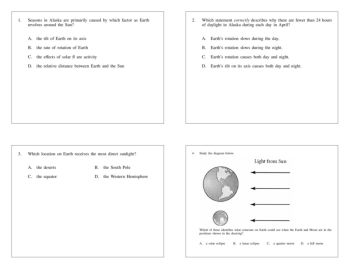 1. Seasons in Alaska are primarily caused by which factor as Earth revolves around the Sun? A. the tilt of Earth on its axis B. the rate of rotation of Earth