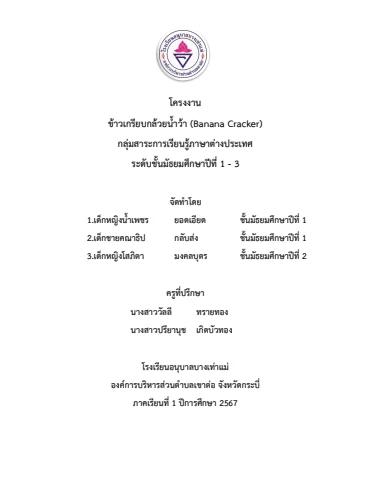 โครงงาน ข้าวเกรียบกล้วยน้ำว้า Banana Crackerระดับชั้นมัธยมศึกษาปีที่ 1-3