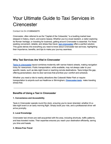 Cirencester, often referred to as the "Capital of the Cotswolds," is a bustling market town steeped in history, charm, and scenic beauty. Whether you’re a local resident, a visitor exploring its Roman heritage, or traveling for business, getting around Cirencester is essential. For those seeking convenient, reliable, and stress-free travel, taxi cirencester offers a perfect solution.